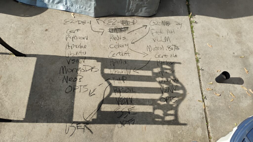 Another long story short, I spent a month learning about what it would take, I drew out an 8 server architecture on my sidewalk with charcoal: API, Redis, FFMPEG, Prep, Dispatch, Inference, MongoDB, Web.